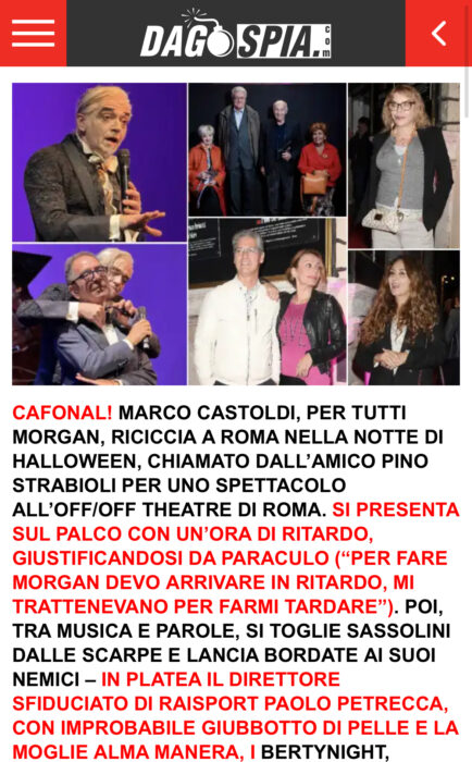 CAFONAL! MARCO CASTOLDI, PER TUTTI MORGAN, RICICCIA A ROMA NELLA NOTTE DI HALLOWEEN, CHIAMATO DALL’AMICO PINO STRABIOLI PER UNO SPETTACOLO ALL’OFF/OFF THEATRE DI ROMA. SI PRESENTA SUL PALCO CON UN’ORA DI RITARDO, GIUSTIFICANDOSI DA PARACULO (“PER FARE MORGAN DEVO ARRIVARE IN RITARDO, MI TRATTENEVANO PER FARMI TARDARE”). POI, TRA MUSICA E PAROLE, SI TOGLIE SASSOLINI DALLE SCARPE E LANCIA BORDATE AI SUOI NEMICI – IN PLATEA IL DIRETTORE SFIDUCIATO DI RAISPORT PAOLO PETRECCA, CON IMPROBABILE GIUBBOTTO DI PELLE E LA MOGLIE ALMA MANERA, I BERTYNIGHT, FAUSTO E LELLA, CAMILLA COSTANZO, FIGLIA DI MAURIZIO, ANIA PIERONI, UN TEMPO MITICA AMANTE DI BETTINO CRAXI, MILENA VUKOTIC, FANNY CADEO E…